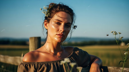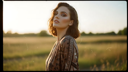 Editorial portrait of woman in field of grass. Country side. Fashion concept.