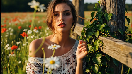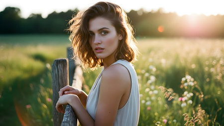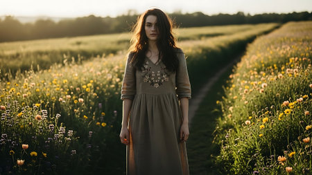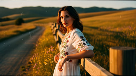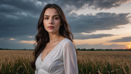Twilight Serenity Vintage Closeup Portrait of Woman in White Dress Standing in Field