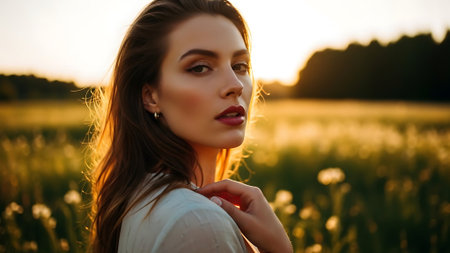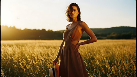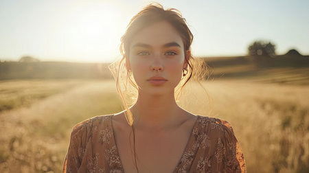 Beautiful young woman in a field at sunset. Beauty, fashion.