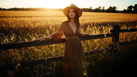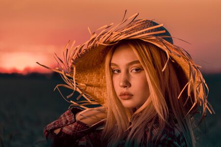 Portrait of a beautiful young woman in a straw hat and dress on a wheat field at sunset.