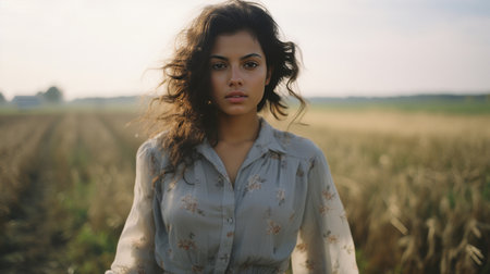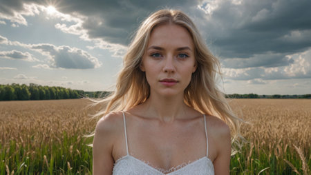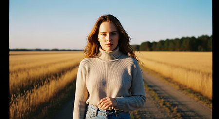 A young woman with long brown hair stands in a serene wheat field, wearing a beige sweater and jeans, with a dirt path and trees in the background under a clear blue sky.