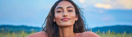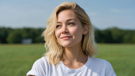 Portrait of a young woman with blonde hair smiling, surrounded by a lush green field and clear blue sky, capturing a moment of serenity and joy in nature.