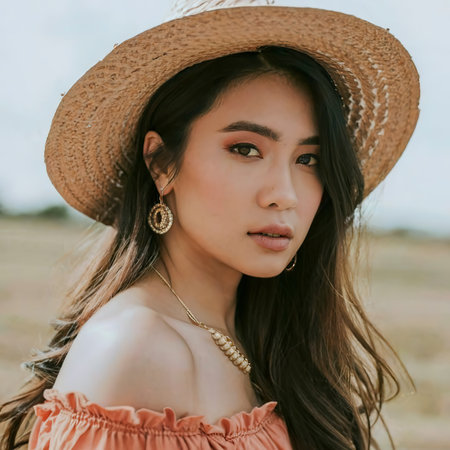 Close up portrait of pretty asian woman, boho style outfit and , make up