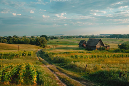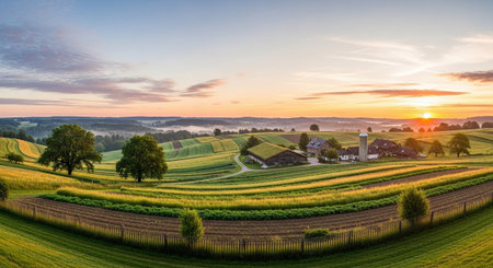 An idyllic rural landscape awakens at sunrise, showcasing rolling green and yellow fields meticulously cultivated into gentle curves. A charming farmstead with a silo and traditional buildings nestles amidst the hills. A light mist hovers in the distant valleys, softening the horizon. The sky is painted with soft hues of orange and pink as the sun begins to ascend. A wooden fence borders some fields, and scattered trees add depth to the serene and peaceful panorama.