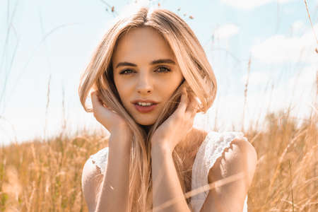 selective focus of dreamy blonde woman touching hair and looking at camera against blue sky in meadow