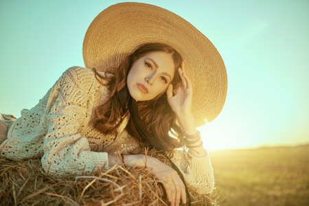 Summer and autumn fashion. Elegant fashion model in knitted sweater and wide-brimmed straw hat lies on a haystack at sunset. Modern boho style. Blue sky and harvest field background.