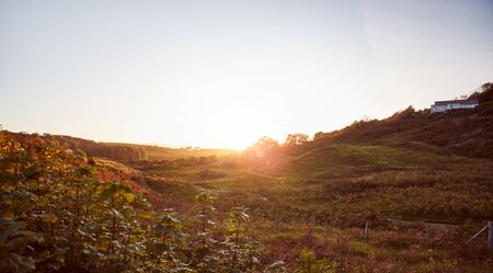 Wide Angle View Of Sun Setting Over Autumn Countryside Landscape
