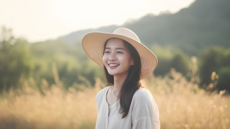 Face of Asian Woman with Rice Field Background at Pa Bong Piang Rice Terraces, Chiangmai Province.