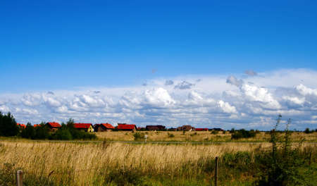 View of a European village with chalet-style houses, a life tree., a lot of sky. The concept of housekeeping, a warm sunny autumn day, balanced. Blue sky and small clouds