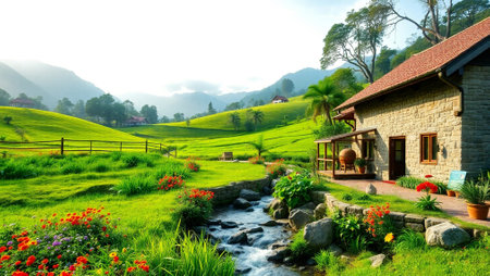 Picturesque rural landscape with farmhouses, a flowing creek, and lush green fields under a bright sky.