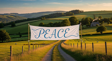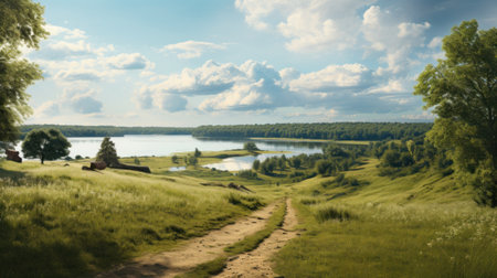 A picturesque rural scene with a rustic house, winding dirt road, and expansive fields. This landscape captures the essence of tranquility and natural beauty in soft lighting.