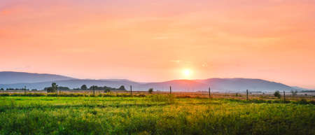 Summer orange sunset over a mountain range. A green field at the foot of the mountains.