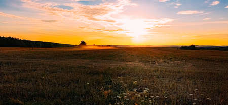 Panoramic sunset and clouds over a wheat field with a path to the horizon panorama web banner header