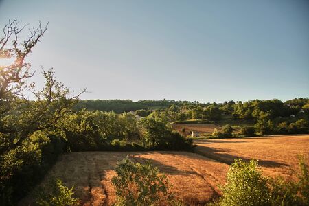 Agricultural fields at sunset, countryside landscape in the south of France at sunny summer evening