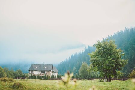 A charming countryside house perfectly nestled among verdant trees and rolling hills, enveloped in a gentle mist that creates a peaceful atmosphere.