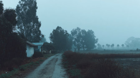A serene rural scene featuring a misty pathway flanked by trees and a distant house. The fog creates a tranquil atmosphere, perfect for nature lovers.