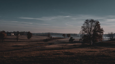 Discover a calm landscape at dawn featuring misty fields and a majestic tree silhouette under a blue sky, capturing the essence of serene rural beauty.