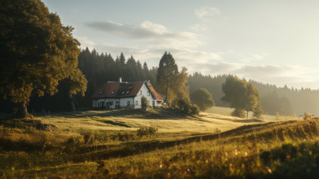 a wooden house on the hillside, capturing the essence of the dusseldorf school of photography with its soft, dreamy landscapes. this charming and idyllic rural scene is bathed in golden light, showcasing the beauty of danish design. the 32k uhd resolution allows for a stunning level of detail and clarity. ai generated