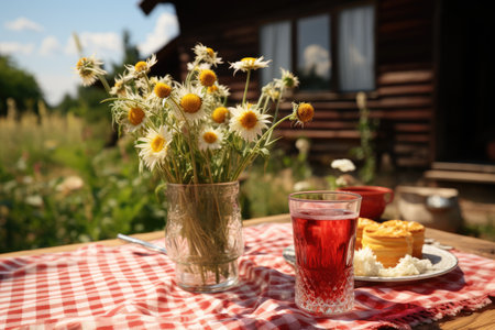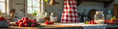 Rustic kitchen interior with strawberries and checkered towel in warm sunlight. That the image is generated using AI.
