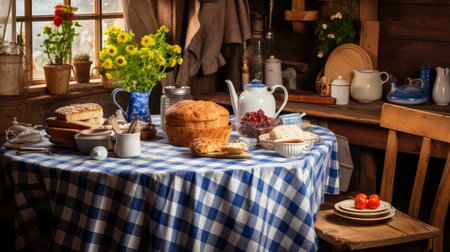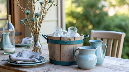 Rustic outdoor breakfast setting with wooden table and blue pottery. That the image is generated using AI.