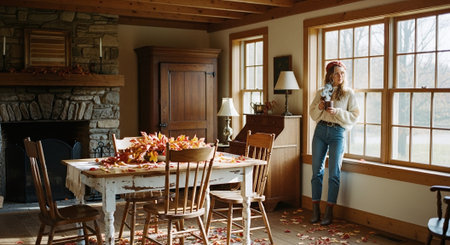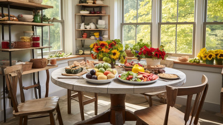A cozy kitchen scene featuring a rustic wooden table set with vintage dishware, bathed in warm sunlight streaming through a large window, creating a serene atmosphere.