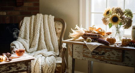 Autumn still life in the kitchen with pumpkins, apples and a cup of tea