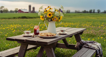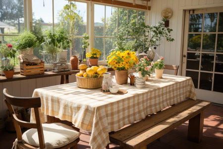 Rustic dining room with vibrant floral centerpiece and wooden furniture. That the image is generated using AI.