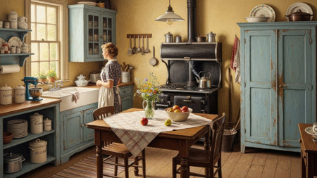 The image showcases a charming, rustic kitchen with vintage cookware, wooden furniture, and abundant natural light, ideal for home decor, lifestyle, or editorial use.