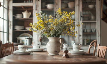 A cozy rustic kitchen featuring a floral centerpiece, neatly arranged plates, and wooden shelves, creating a warm and inviting atmosphere for dining.