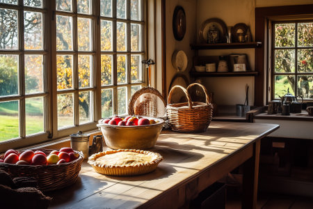 A charming rustic kitchen scene adorned with fresh, vibrant apples, a delectable pie, and inviting warm autumn decor. Generative AI
