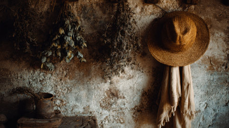 A charming rustic interior scene featuring a straw hat and dried herbs hanging against a textured wall, evoking a warm and cozy atmosphere in natural tones.