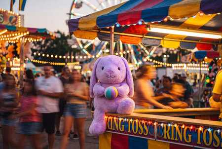 Purple bunny plush toy sits as prize on ring toss stall at carnival with colorful striped canopy lights and blurred crowd background for fun fair atmosphere