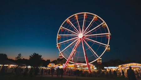 Colorful ferris wheel illuminated at night. Mesmerizing light trail effect at a lively carnival with vibrant attractions