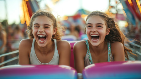Two joyful girls laugh with excitement while riding a roller coaster at an amusement park, enjoying a thrilling and unforgettable experience