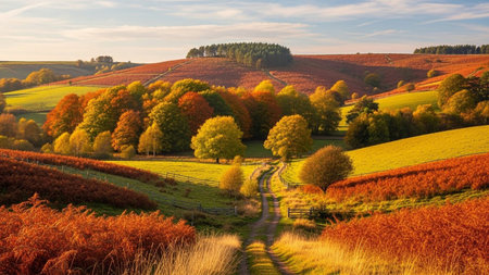 Rolling hills display vibrant autumn foliage in shades of orange, yellow, and red, with a dirt path winding through...
