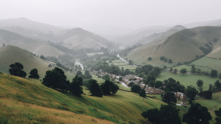 Discover a breathtaking countryside view featuring rolling hills and a quaint village enveloped in mist. This serene landscape captures the essence of nature and tranquility.