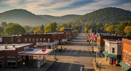 Small showing american small town main street lined with brick buildings and a us flag flying on a sunny autumn day. resolution