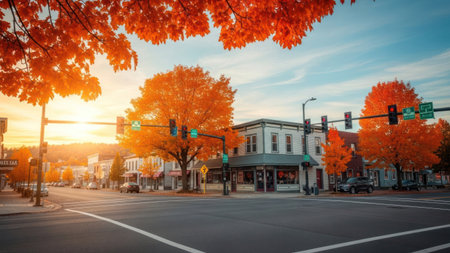 A picturesque street scene showcases a town during autumn. The image features buildings, intersections, and vibrant orange trees. The composition includes a clear sky with sunlight creating a bright, inviting atmosphere. The overall style is realistic.