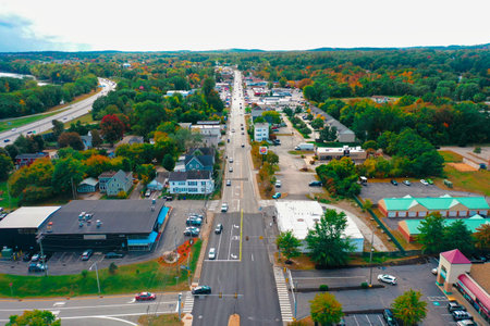 Tewksbury historic town center aerial view panorama on Main Street in fall, Tewksbury, Massachusetts, MA, USA.