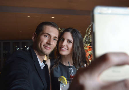 couple by becoming a selfie with your mobile phone in a stylish bar while drinking a cocktail