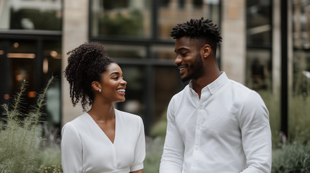 Couple enjoying a joyful moment in a modern urban setting with greenery and stylish architecture