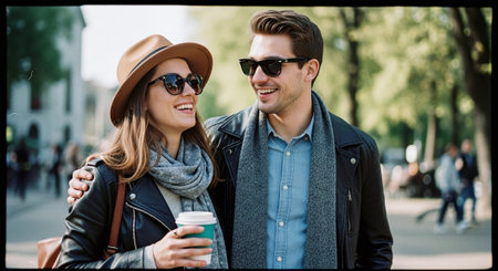 beautiful young couple in sunglasses and hats holding coffee to go and smiling on street