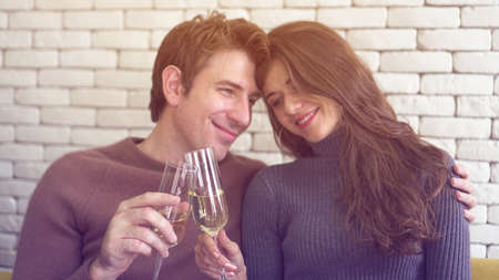 Romantic couple taking a cup of coffee and looking at each other while sitting on couch