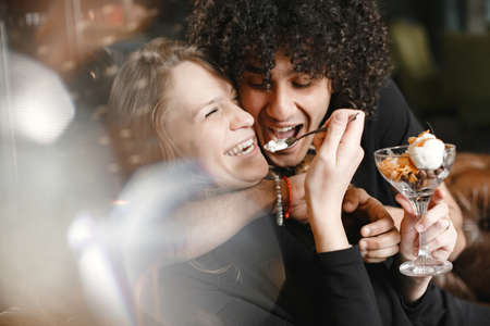 friends hangout at coffee shop or bar. couple date. modern youth leisure. girl taking a selfie with her boyfriend.