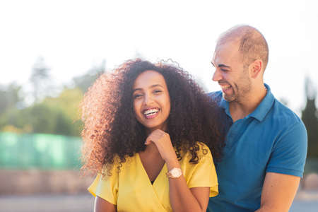 Young interracial couple hugging. Millennial lovers, african and white couple