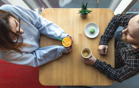 Young guy and girl at a table in a cafe with juice and coffee, top view.