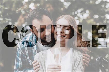 Couple in Love. Man and Disabled Girl on Date. Handsome Man Hugging Beautiful Girl in Wheelchair. Woman holding Glass of Champagne. Happy Couple on Romantic Date. Relationship Concept