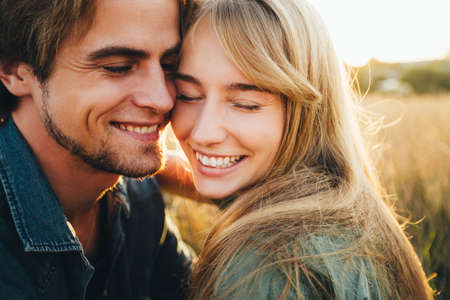 Young happy couple hugging and laughing. Space for text. Close-up.