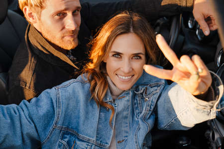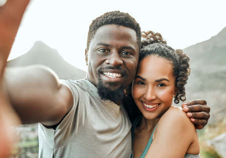 Mobile Phone selfie of a young adult caucasian couple looking camera. Happy boyfriend and smiling girlfriend having fun together