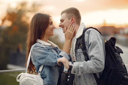 Young couple of tourists are exploring new places together. Travel concept. Boyfriend and girlfriend in vacation.